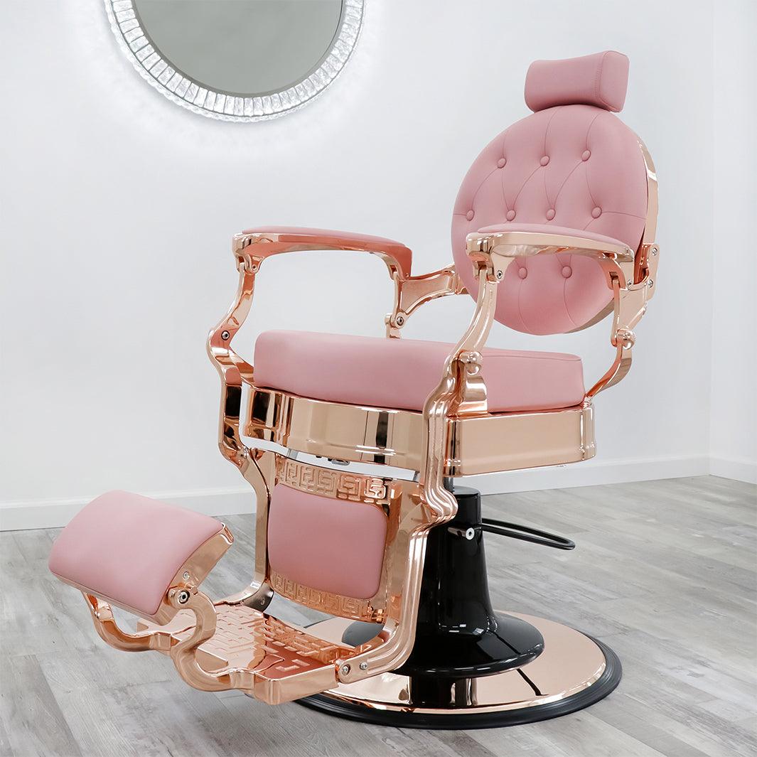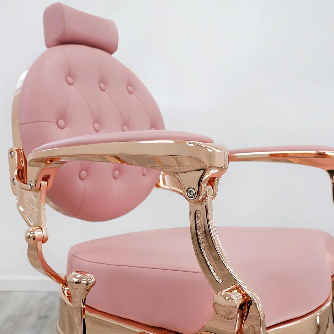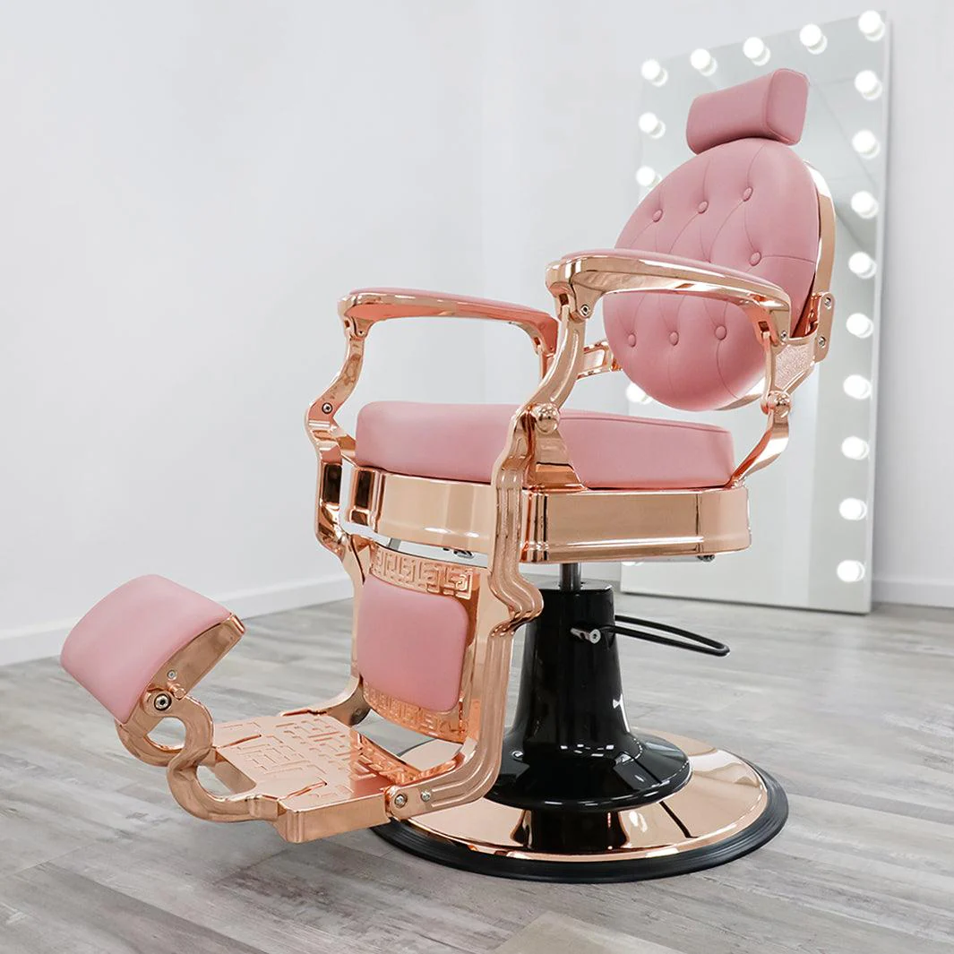 • Rose Gold Chrome Accents: The elegant rose gold finish on the frame and geometric-patterned footrest adds a touch of luxury, setting it apart from standard barber chairs for sale near me.