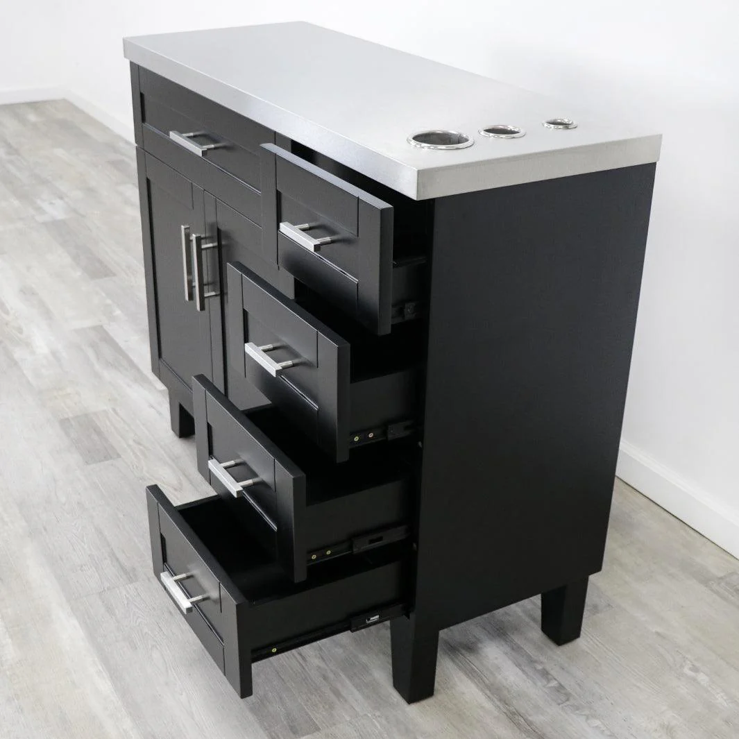 Four Pull-Out Drawers: These black salon stations include three medium pull-out drawers and one small pull-out drawer, offering ample storage for tools, products, and accessories.