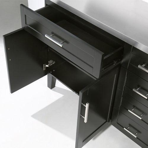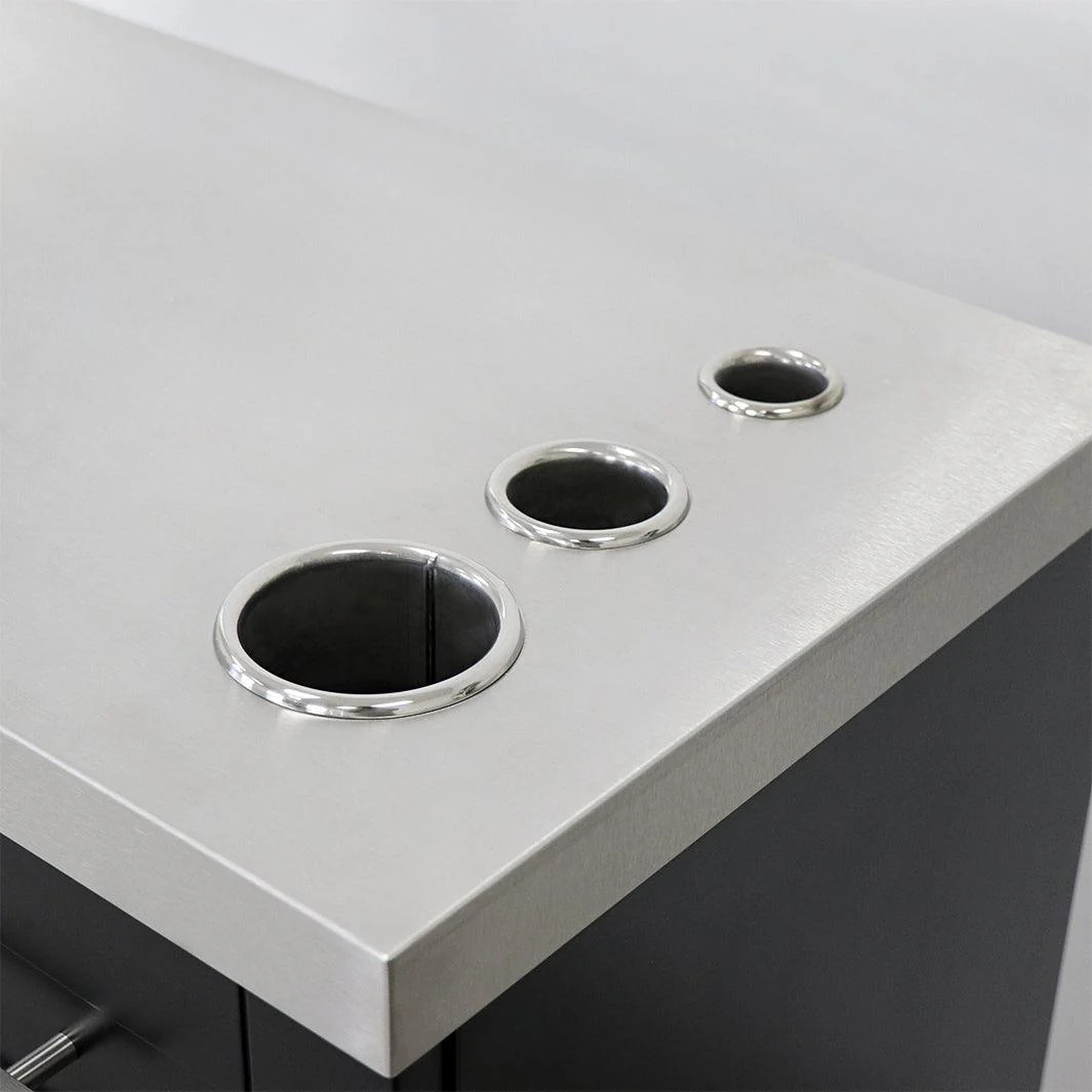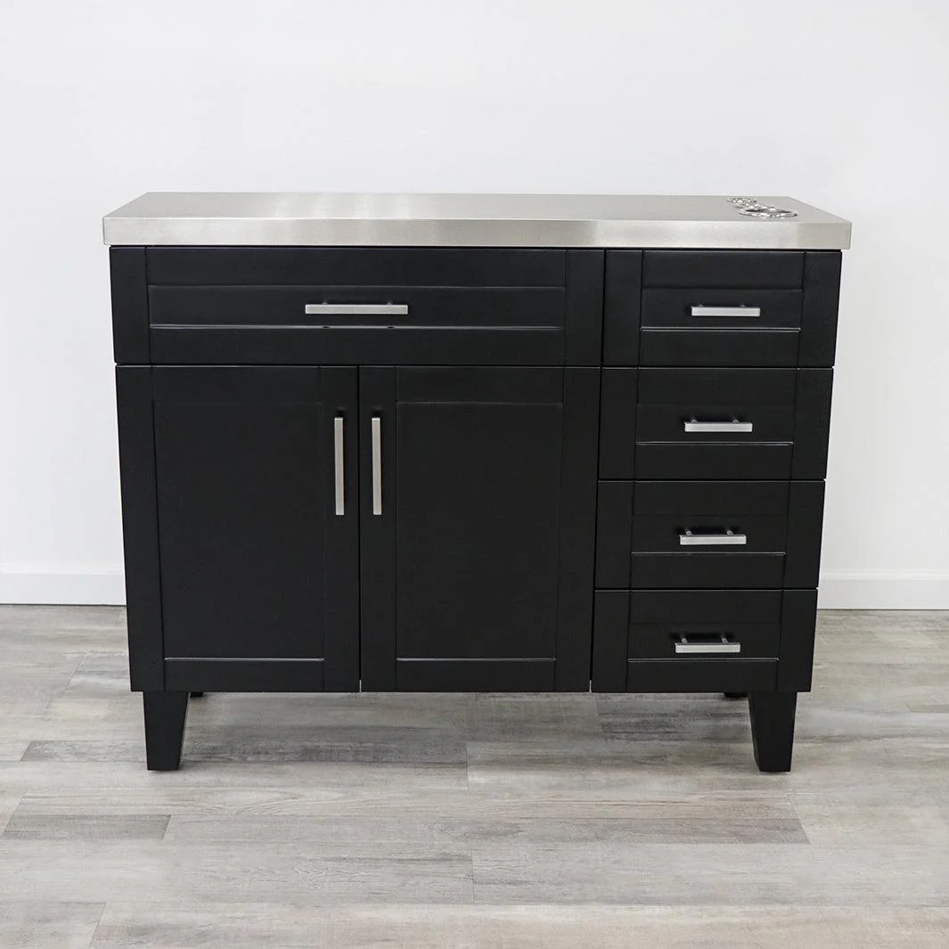 Sleek Stainless Steel Countertop: The sleek stainless steel countertop complements the black finish, making these black salon stations a stylish centerpiece in your workspace.
