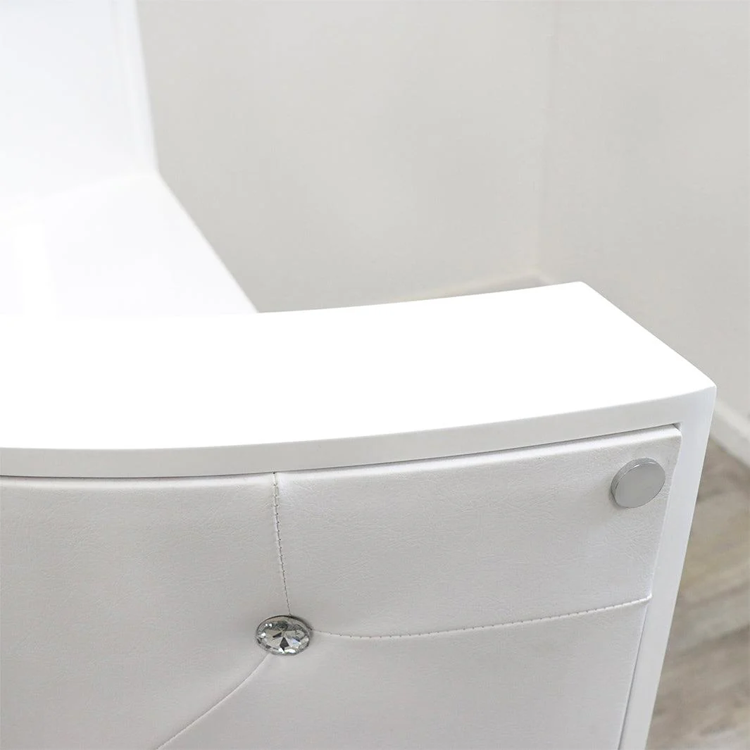 Tufted Rhinestone Buttons: The White Glam Reception Desk features a fully upholstered front with durable white PVC vinyl, delicately embellished with tufted rhinestone buttons, adding a touch of glamour to your workspace.Baked White Finish: The desk is manufactured with durable engineered hardwood and topped with a baked white finish, ensuring a sleek and modern look that complements any office décor.Half-Circle Countertop: The spacious half-circle countertop provides ample workspace while maintaining a stylish, curved design that enhances the flow of your reception area.Benefit: Elevate your office’s first impression with a curved reception desk that exudes luxury and sophistication. - Functional Storage for Office Essentials