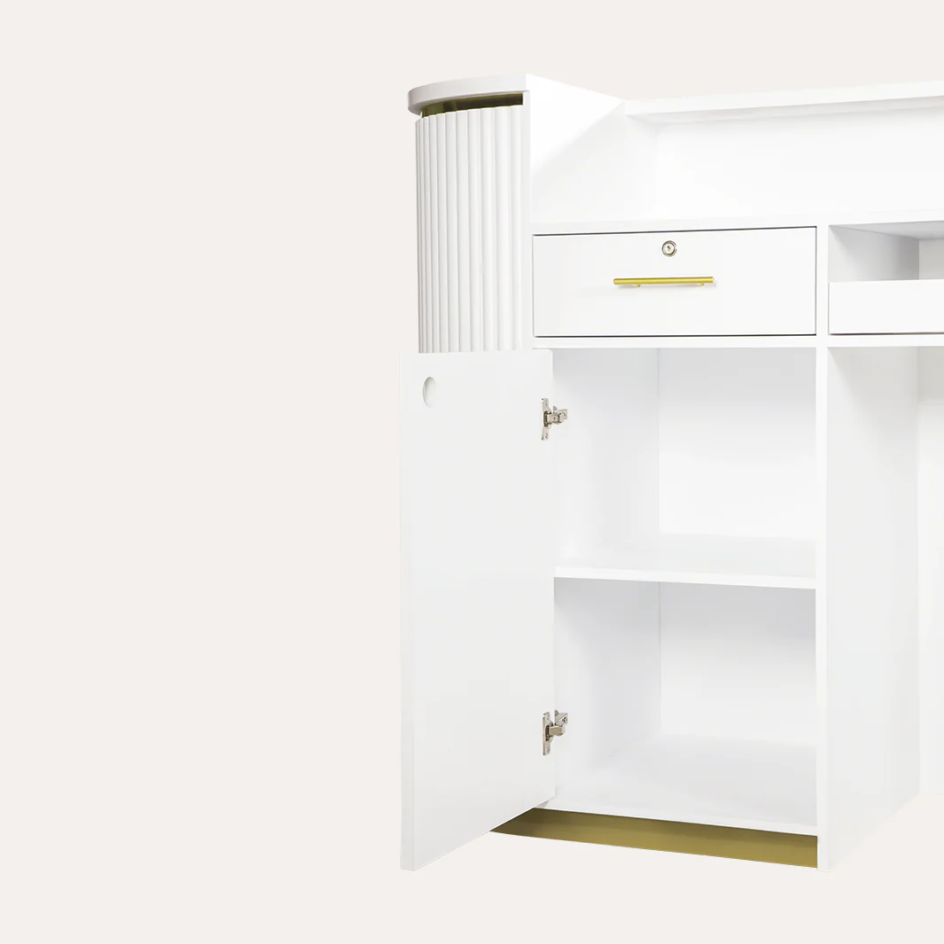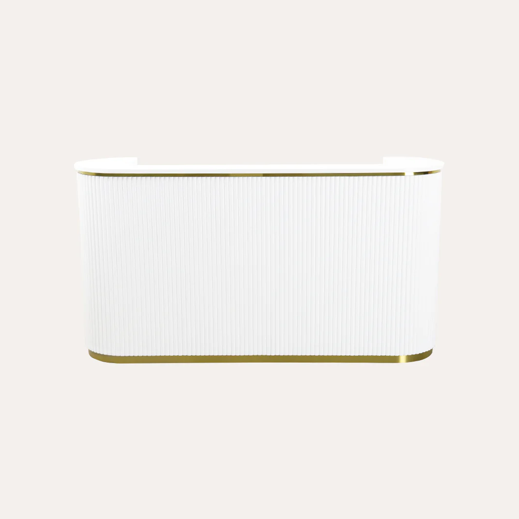 Vertical Tambour Solid Wood: The Grand René Tambour Reception Desk is crafted from high-quality vertical tambour solid wood, ensuring durability and a timeless aesthetic.Gold Accents: The gold detail along the top and the gold toe kick feature at the bottom add a touch of sophistication, making this hair salon reception desk a standout piece in your salon.Baking Paint White Countertop: The white countertop is not only sleek and modern but also easy to clean and maintain, ensuring your hair salon reception desk always looks pristine.