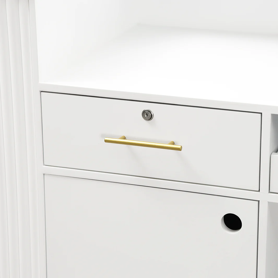Two Lockable Drawers: The Grand René Tambour Reception Desk features two lockable drawers, providing secure storage for important documents, cash, and other valuables.Pull-Out Keyboard Drawer: The pull-out drawer is perfect for storing keyboards, laptops, or other small essentials, keeping your reception area organized and clutter-free.Ample Cubby Space: With multiple cubby spaces underneath the desk, you can organize salon essentials like appointment books, product samples, and client files.