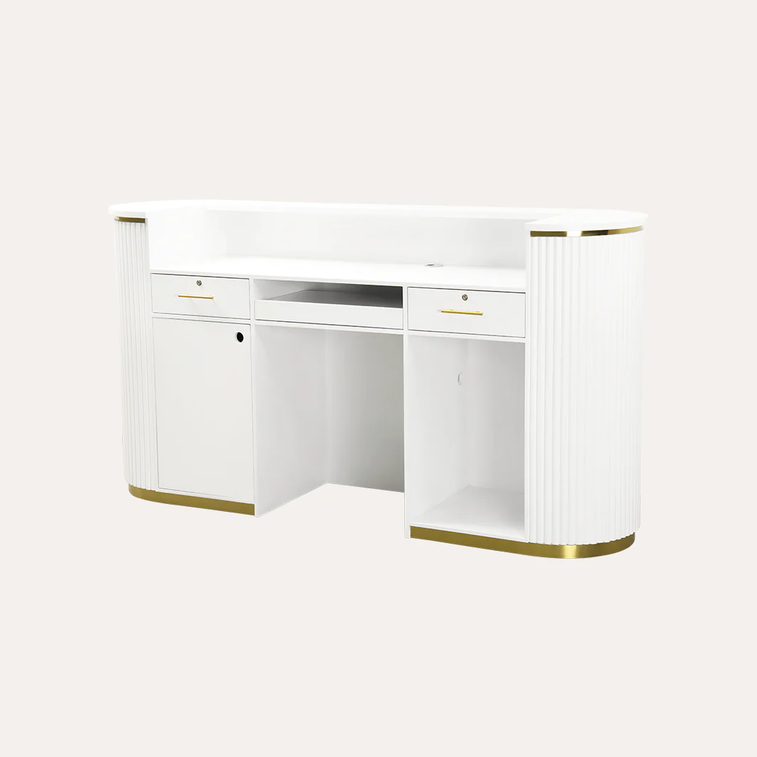 With its vertical tambour solid wood construction, gold accents, two lockable drawers, and a pull-out keyboard drawer, this hair salon reception desk is built to enhance both the look and functionality of your salon. Below, we break down its features, benefits, and why it’s the perfect addition to your hair salon reception area.