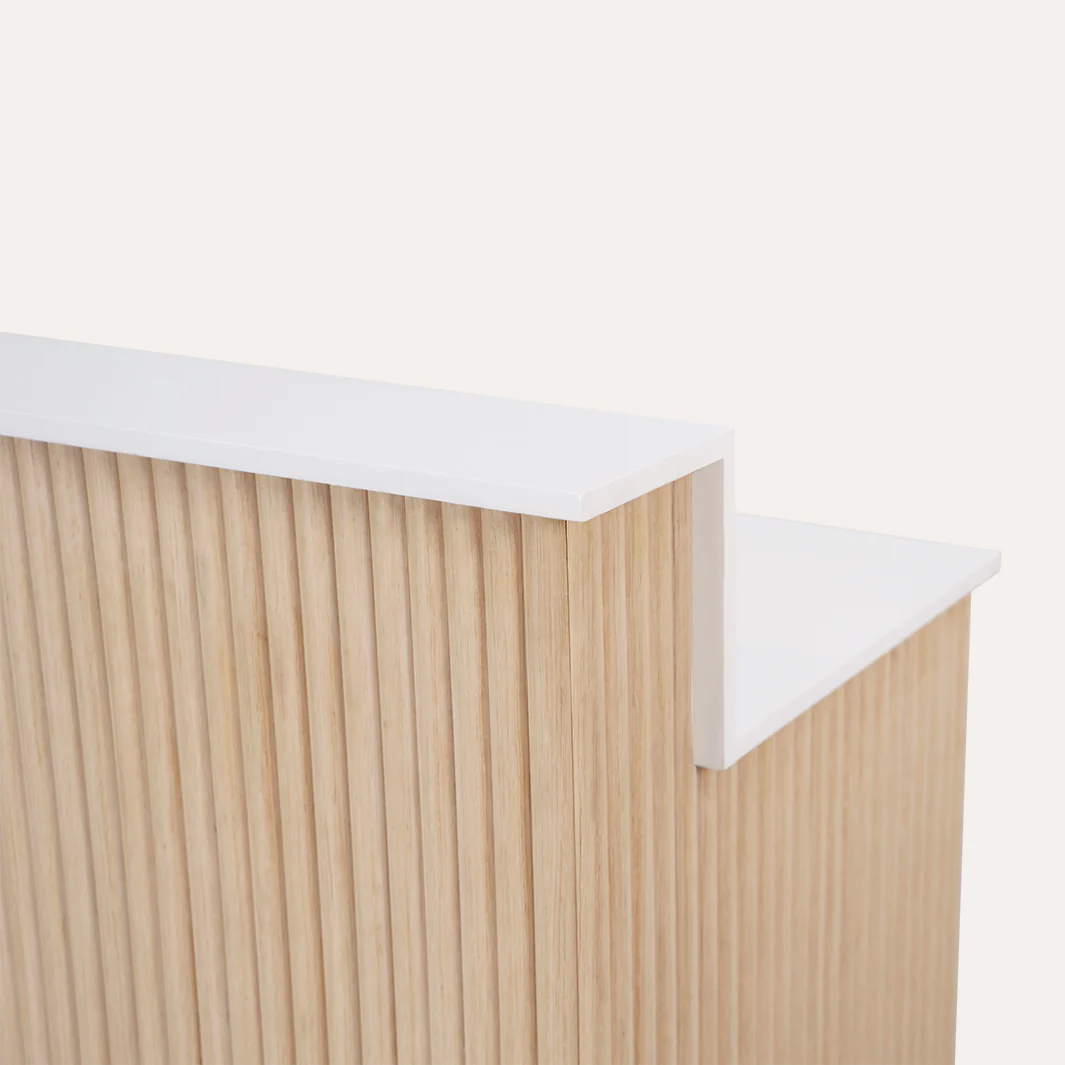 Vertical Tambour Solid Wood: The Nouveau Tambour Reception Desk (Small) is crafted with vertical tambour solid wood, offering a timeless and sophisticated aesthetic that complements any office décor.Baking Paint White Countertop: The white countertop and desk area provide a sleek, modern look while being easy to clean and maintain.Black Hardware: The black hardware adds a touch of elegance, making this L-shaped reception desk a standout piece in your workspace.Benefit: Elevate your office’s first impression with a reception desk that exudes professionalism and style. - Functional Storage for Office Essentials