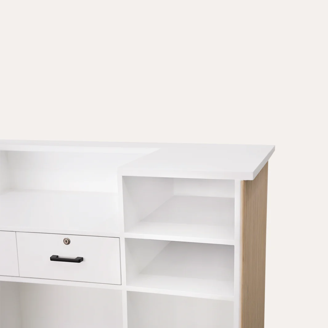With its baking paint white countertop, vertical tambour solid wood construction, two lockable drawers, and ample cubby space, this office reception desk is built to enhance both the look and functionality of your workspace. Below, we break down its features, benefits, and why it’s the perfect addition to your office reception area.
