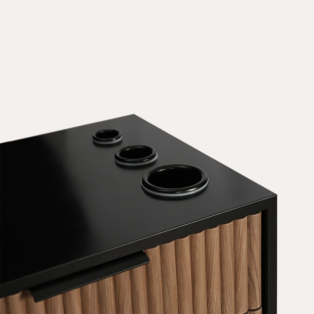 Walnut Tambour Front: The Noir Tambour Styling Station features a stunning walnut tambour front paired with a sleek black painted frame, creating a luxurious and timeless look.