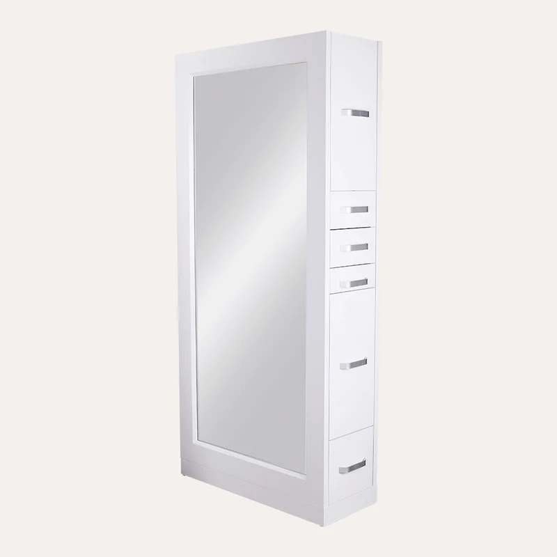 Delicate Silver Handle Detailing: Sleek silver handles add a touch of sophistication, making these salon stations for sale a stylish centerpiece in your workspace.